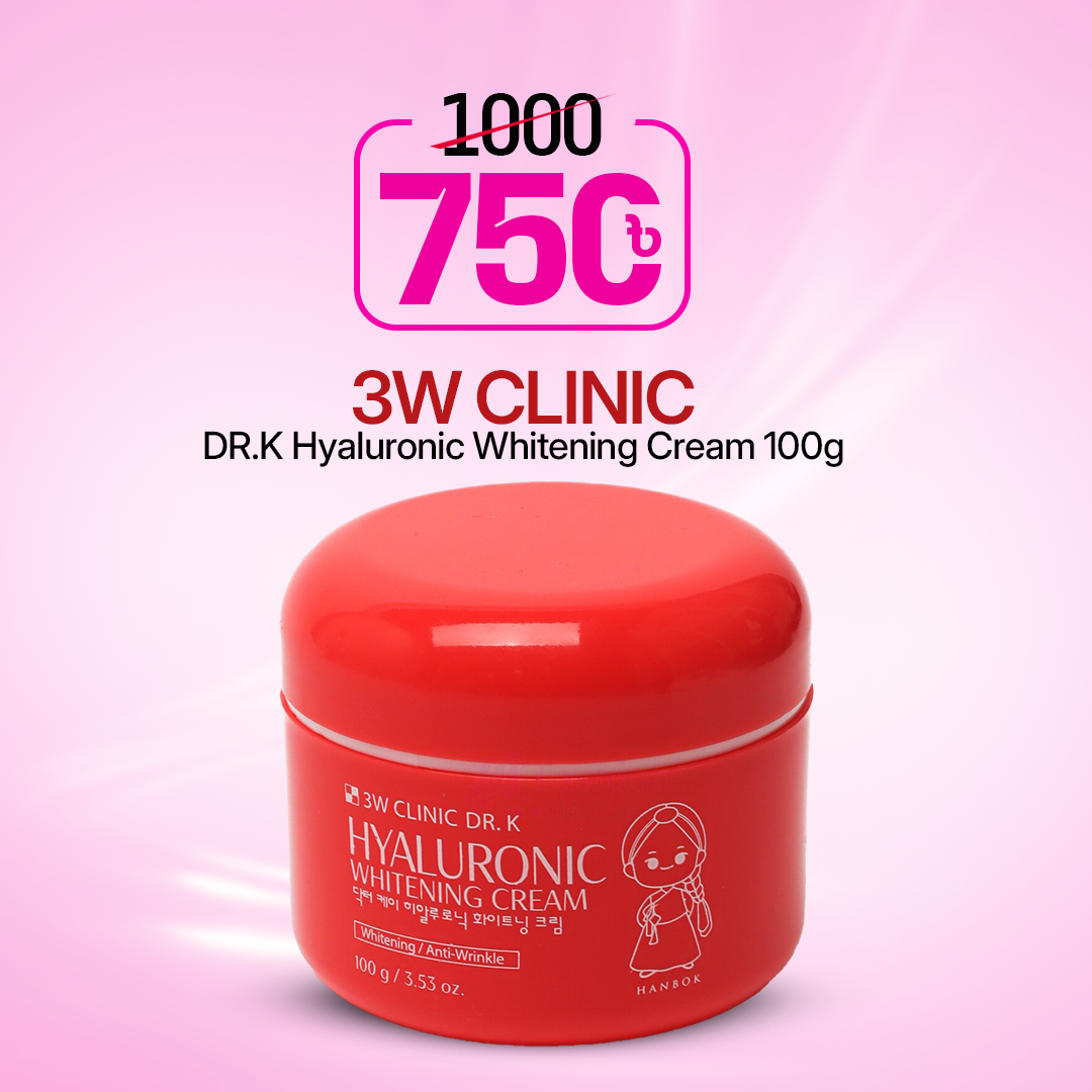 Achieve radiant skin with 3W Clinic DR.K Hyaluronic Whitening Cream. This hydrating formula combines hyaluronic acid and whitening agents to brighten and moisturize, now available at Fashionskincarebd.