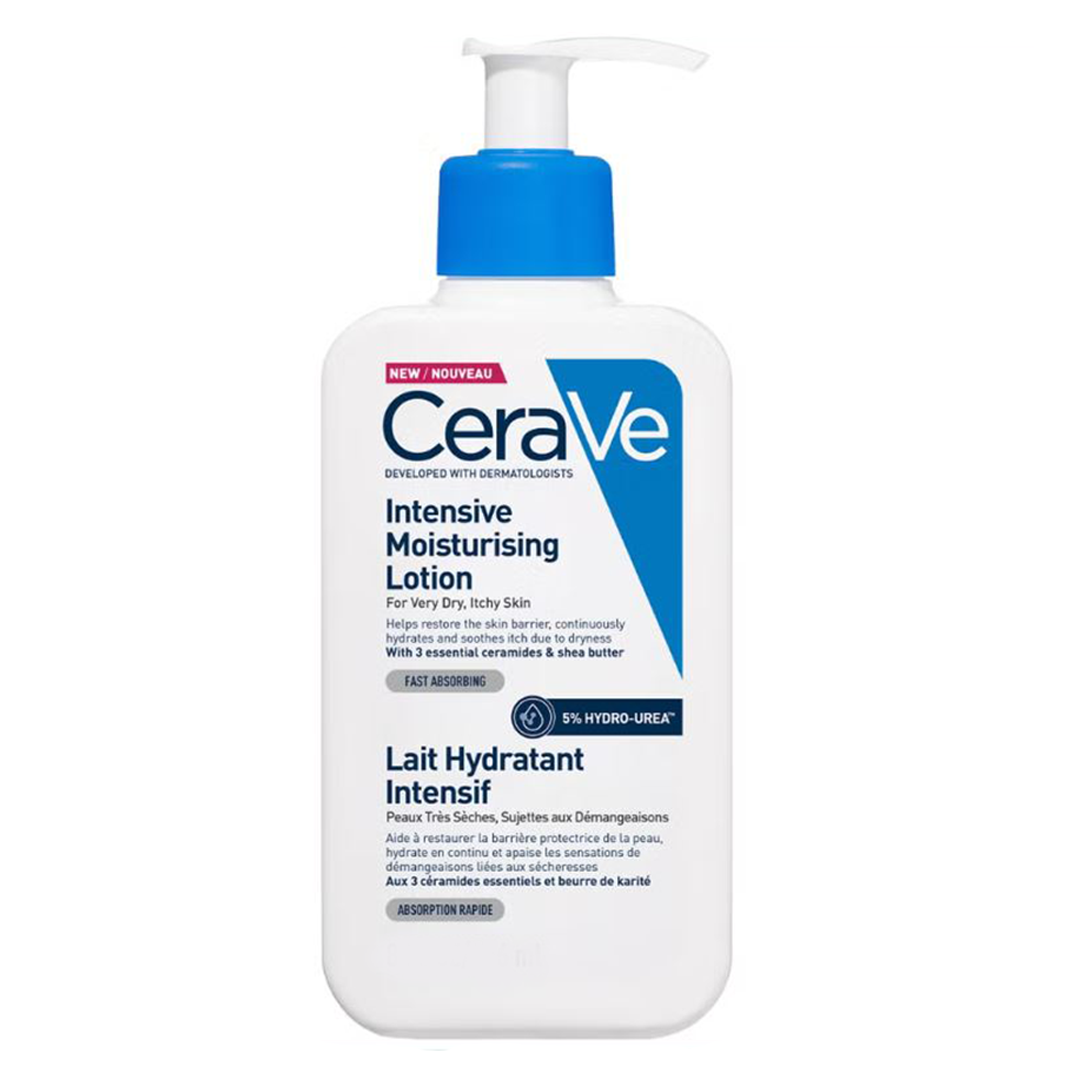 CeraVe Intensive Moisturizing Lotion 237 ml is a dermatologist-developed body lotion ideal for dry to very dry, sensitive skin. With ceramides, hydro-urea, hyaluronic acid, and shea butter, it deeply hydrates, restores the skin barrier, and relieves dryness, flaking, and itch — all without greasiness.