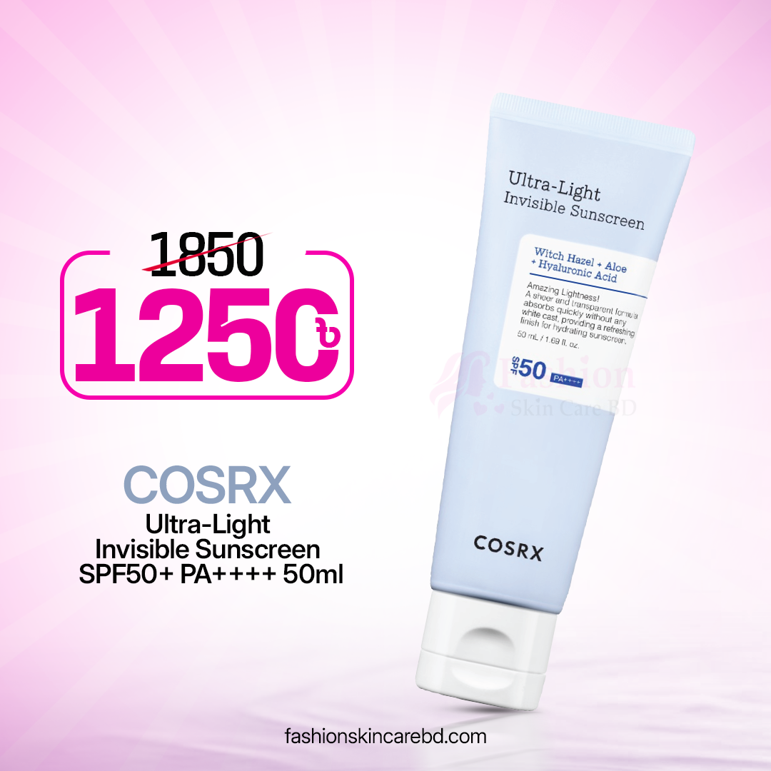 At fashionskincarebd, we offer only genuine Korean skincare products, including the highly rated COSRX Ultra-Light Invisible Sunscreen SPF50+ PA++++ 50ml. Give your skin the ultimate sun protection with this lightweight, non-greasy sunscreen that works wonders for every skin type. Shop now and enjoy flawless, protected skin every day!