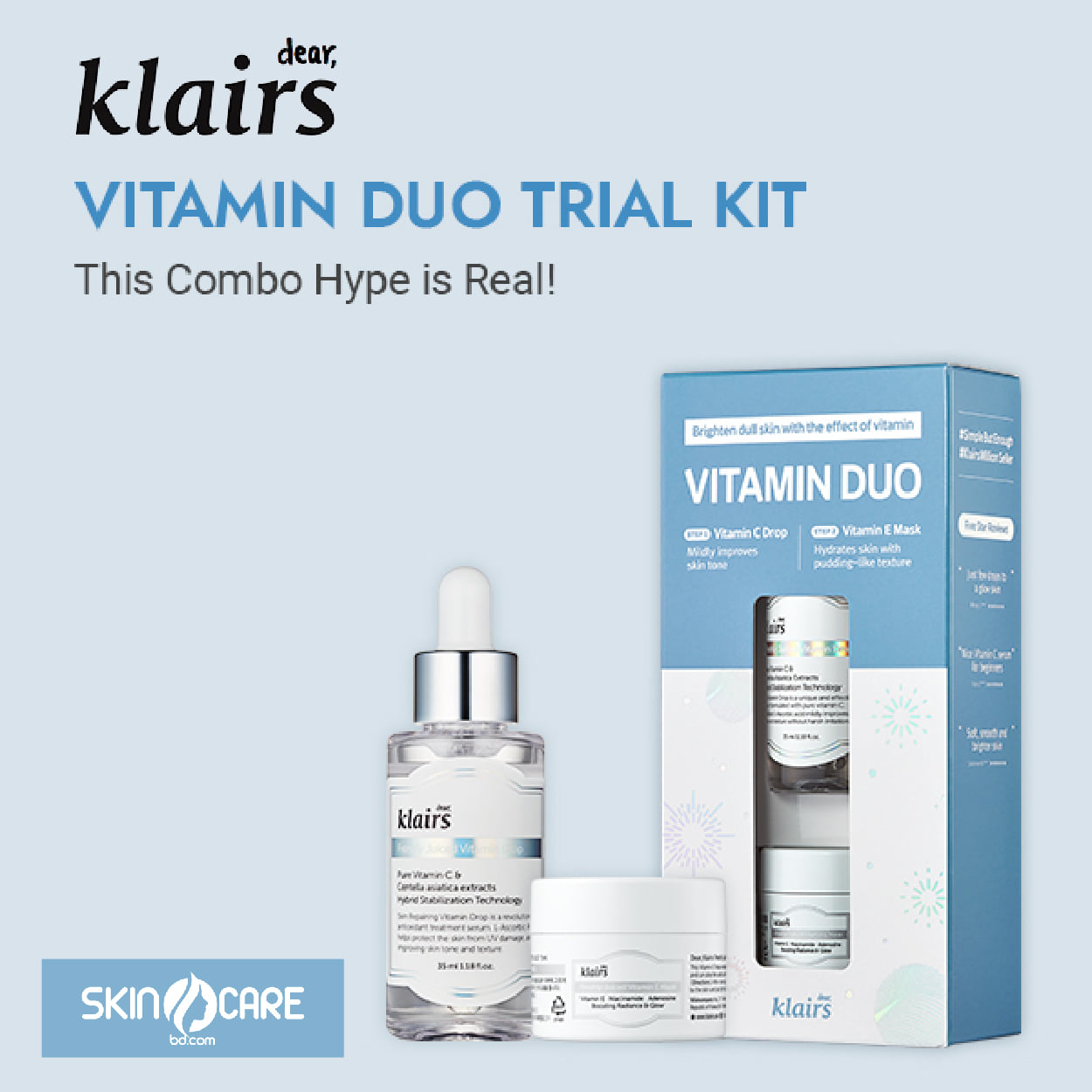 The Klairs Vitamin Duo Trial Kit is a convenient starter set designed to introduce your skin to the benefits of Vitamin C and Vitamin E. Perfect for brightening dull skin, evening skin tone, and enhancing radiance, this kit includes travel-friendly sizes of Klairs’ Vitamin C Serum and Vitamin E Cream, providing gentle yet effective care suitable for all skin types, including sensitive skin.