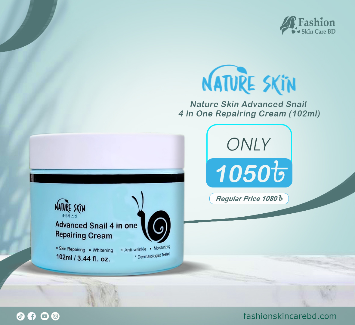 Nature Skin Advanced Snail 4 in One Repairing Cream is a multi-functional skincare solution enriched with snail mucin extract. Designed to repair, hydrate, and brighten the skin, this cream delivers visible results for healthier, smoother, and more radiant skin.