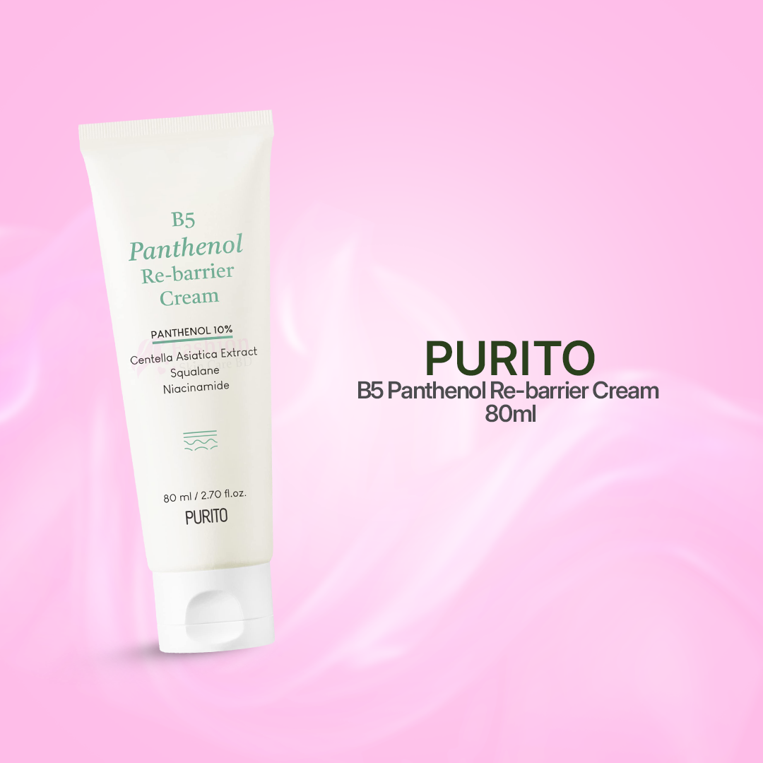 Revitalize your skin with Purito B5 Panthenol Re-barrier Cream, available at fashionskincarebd. This nourishing cream features panthenol (Vitamin B5) to strengthen and restore the skin barrier, while hyaluronic acid provides deep hydration. Enriched with Centella Asiatica Extract to soothe and calm sensitive skin, it absorbs quickly without leaving a greasy residue. Ideal for daily use, this cream supports a healthier, more resilient complexion.