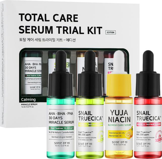 - Multi-Functionality: The Some By Mi Total Care Serum Trial Kit combines several targeted serums, each designed to address specific skin concerns. Whether you need to brighten your complexion, reduce acne, or hydrate your skin, this kit has everything you need for comprehensive skincare.